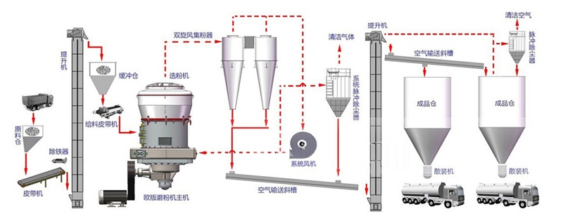 原料從儲(chǔ)倉落入到計(jì)量皮帶機(jī)上,通過自卸式除鐵器除鐵后進(jìn)入歐版磨進(jìn)行粉磨,粉磨后的物料經(jīng)過風(fēng)力作用通過選粉機(jī)進(jìn)行分選,選出符合要求的成品粉,通過旋風(fēng)收集器進(jìn)行收集暫存。