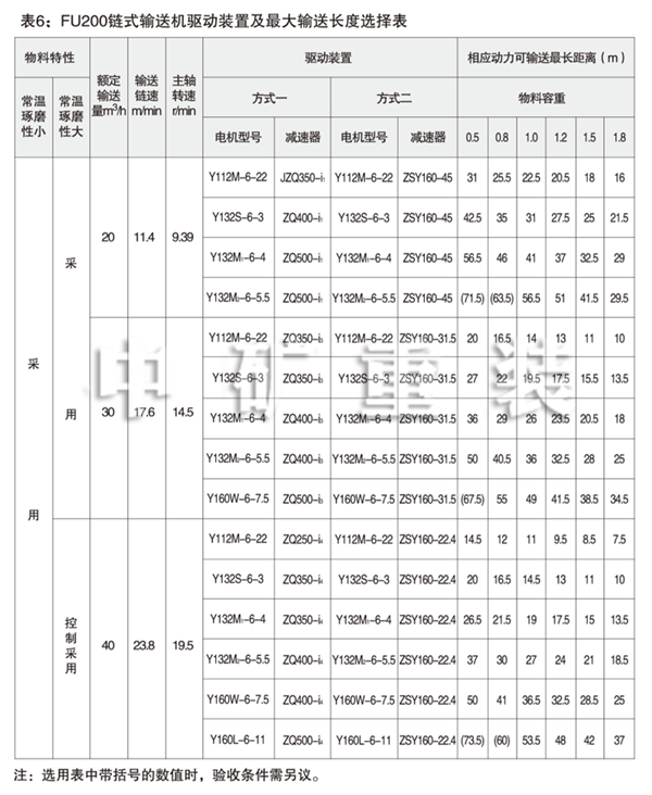 表5: FU150鏈式輸送機驅(qū)動裝置及輸送長度選擇表 Table 5: FU150 Chain Conveyor Drives and Max Conveying Distances