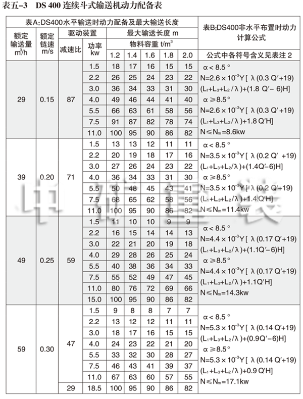1、DS 400連續(xù)斗式輸送機動力配備表
