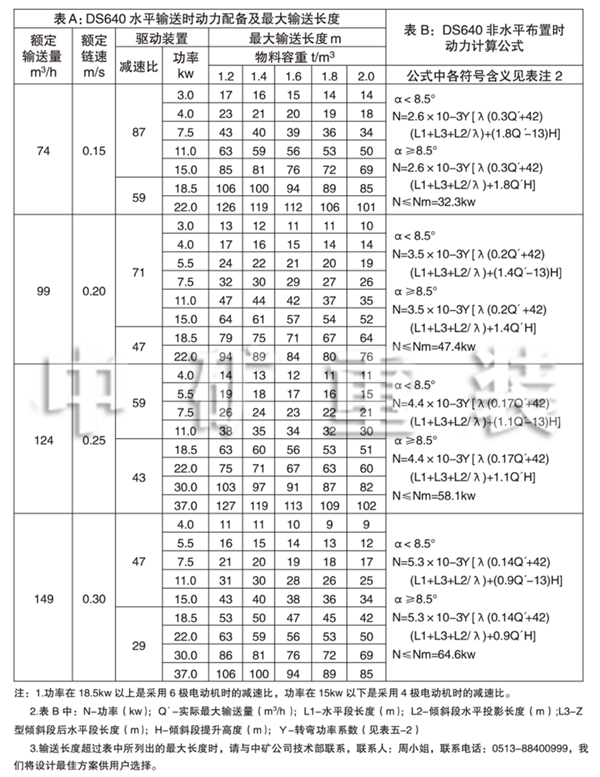 3、DS 640連續(xù)斗式輸送機動力配備表